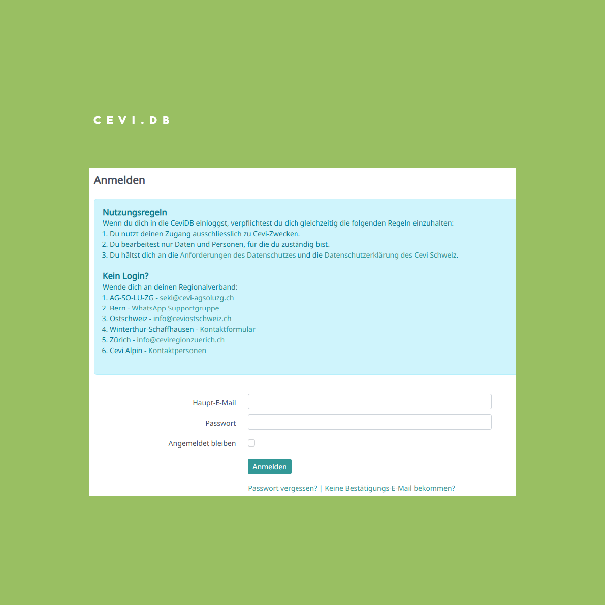 Die Cevi.DB ist eine Datenbank, die von unserem Regionalverband, dem Cevi Schweiz und anderen Jugendverbänden genutzt wird. Datenschutz ist ein wichtiges Thema und wird regelmässig überprüft und sichergestellt.