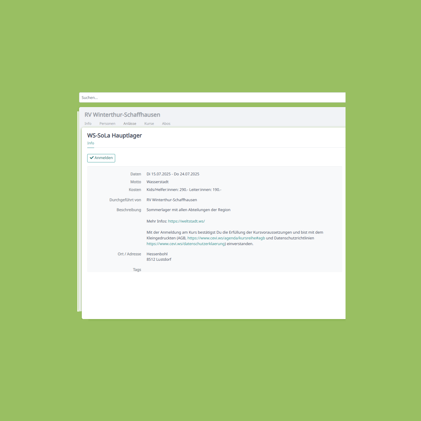 Wir von der Cevi Region Winterthur-Schaffhausen arbeiten bei der Organisation der Lager mit der Cevi.DB. Du kannst Dich direkt für das Lager via Cevi.DB anmelden und sparst dir so das Ausfüllen und zurücksenden des Anmeldebogens. Da deine Daten bereits erfasst sind, geht eine Anmeldung innerhalb von Minuten schnell und einfach.